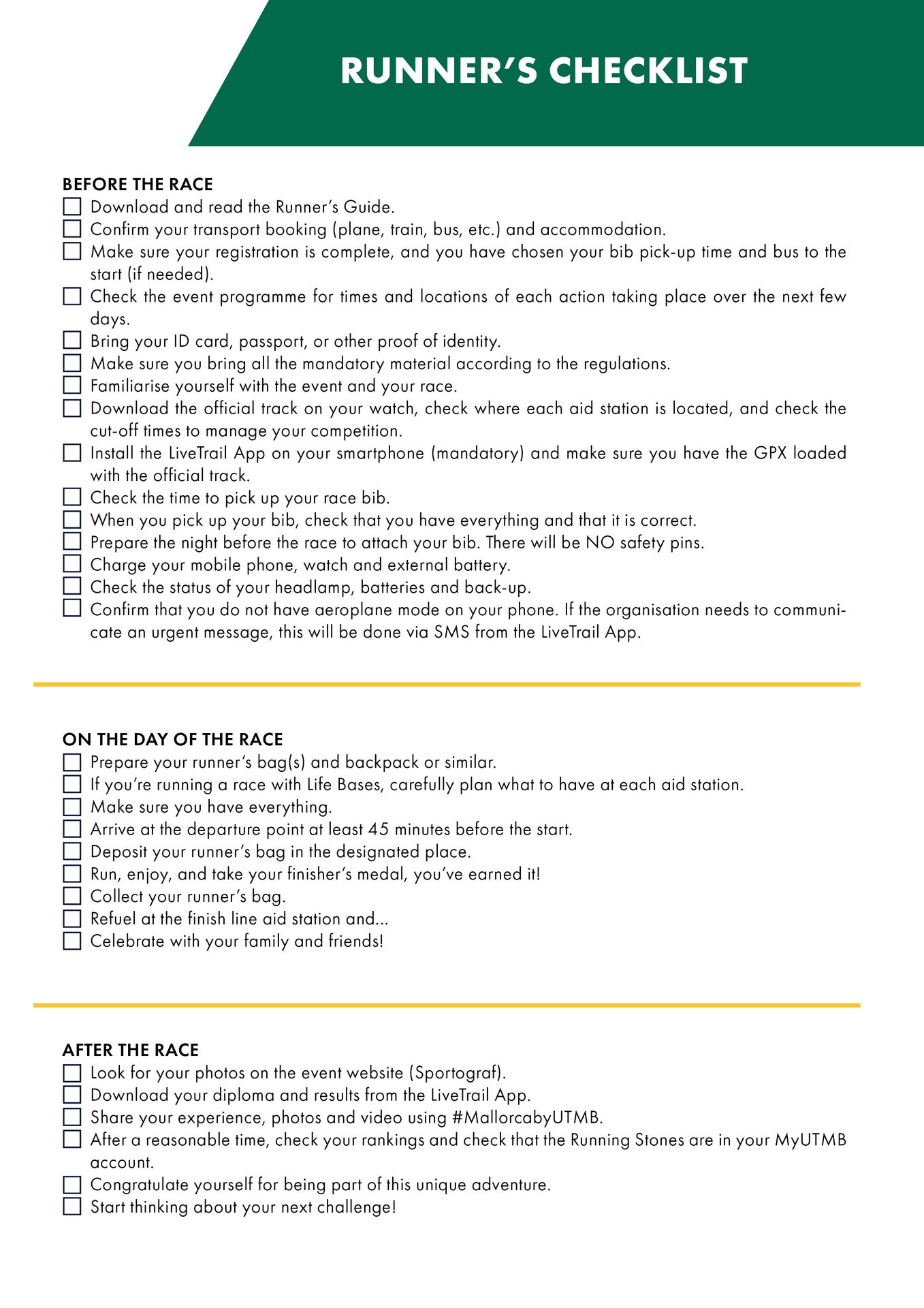 Check out the 2025 Runner and Supporter Guide for Mallorca by UTMB®! Everything you need to know about your participation in the event: schedules, transfers, mandatory equipment, safety, live tracking… Read it carefully, as it contains answers to all your possible questions. We’ve also included a special section for your supporters, so they can experience every moment of your adventure and share this unforgettable experience with you.
